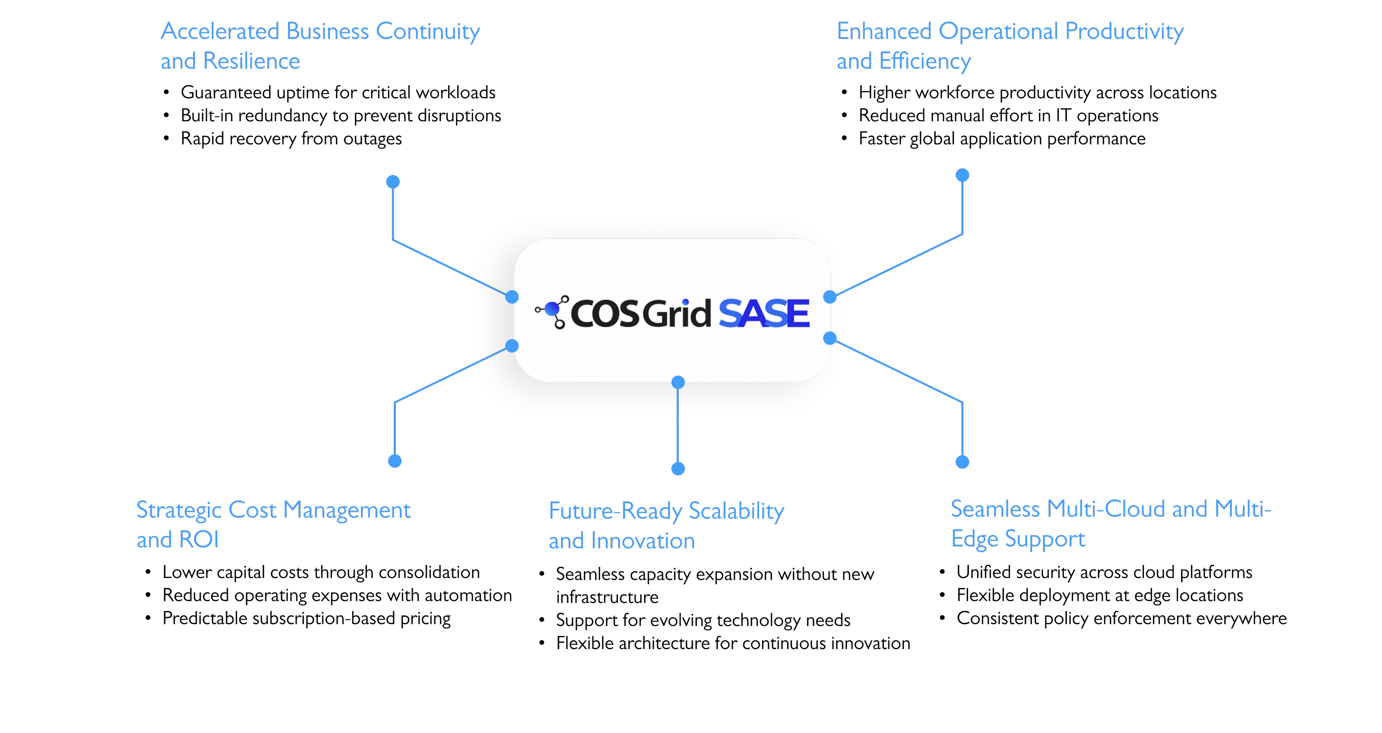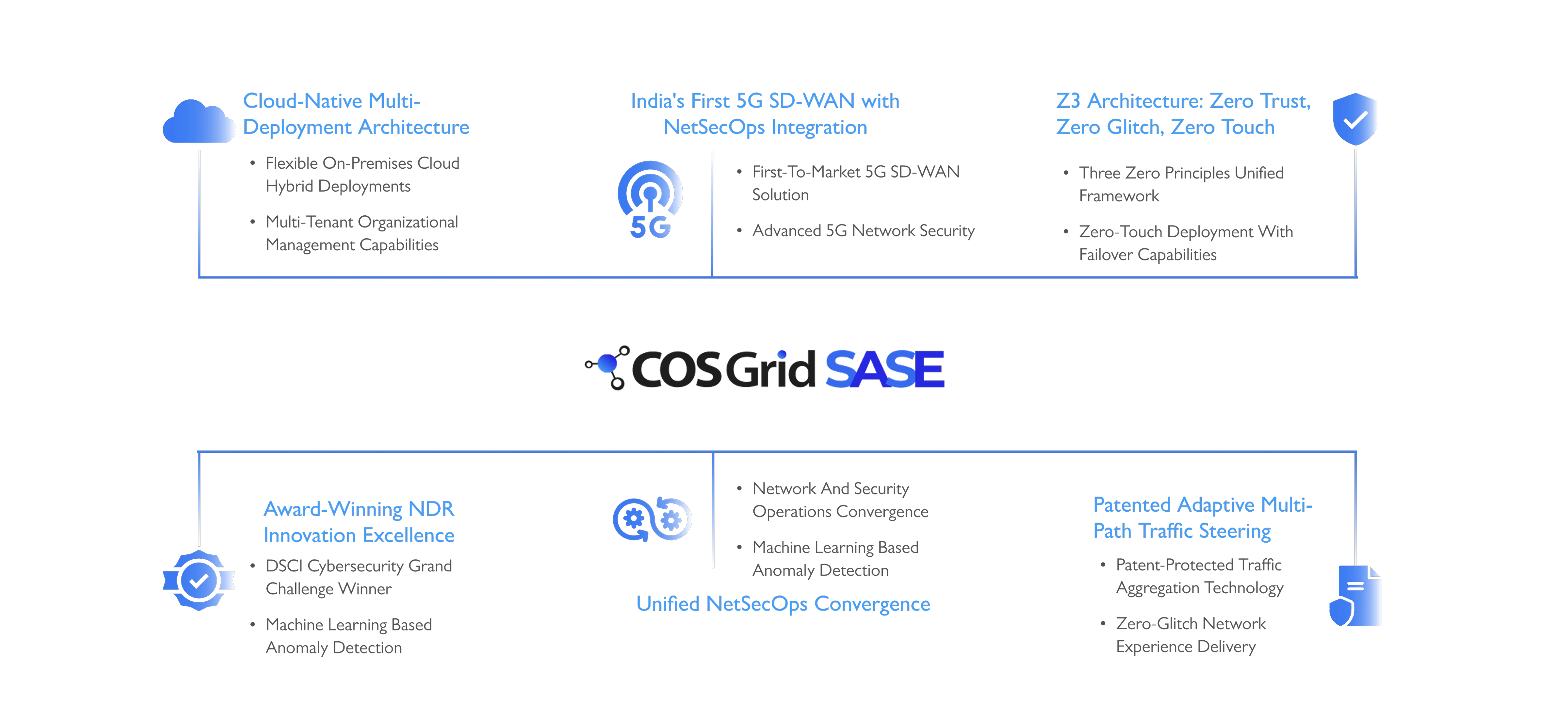 COSGrid Z3 SASE unifies advanced networking and security by combining Secure Access Service Edge (SASE) principles with our innovative MicroZAccess (ZTNA), Secure Gateway, and RefleX SD-WAN technologies. It delivers zero-trust connectivity, robust threat protection, and simplified management for distributed sites and remote teams by leveraging both 5G wireless and wired networks for secure, reliable performance and future-ready flexibility